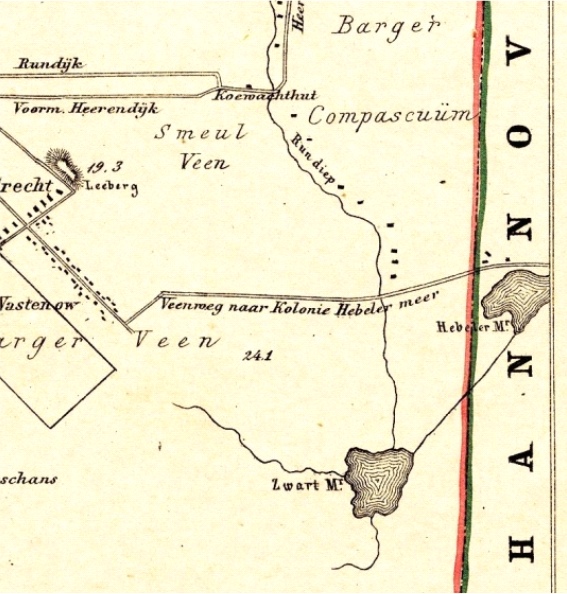De militaire kaart van Hugo Suringar uit 1867 noemt de weg de ‘Veenweg naar Kolonie Hebeler meer’. Ten noorden van het meer