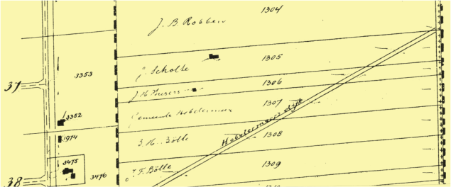 en 38. Daarna maakt de vonder (niet zichtbaar op de kaart) doorgang in oostelijke richting mogelijk. Tussen de beide huizen 3352,