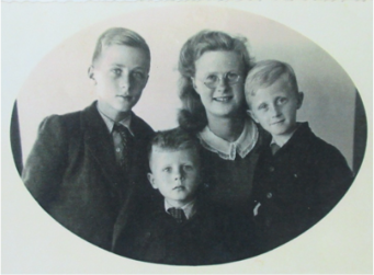 De kinderen Van Zanden tijdens de oorlog. Vlnr; Theun, Lieuwe, zus Jo en Bert